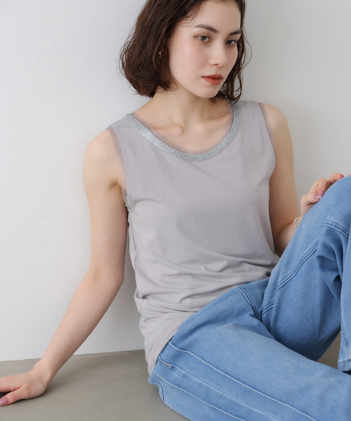 毎年人気のタンクトップが新色を追加して今年も登場。チェーンとシルバーモチーフでアクセントをつけたシンプルタンクトップ。 ネックラインには、チュールとキラキラとしたラメ感のある糸を使用したアビガイルチェーンをレイヤードし、さりげない華やかさをプラス。 一枚インナーに入れるだけで、ネックレスいらずで顔まわりを明るく見せてくれます。