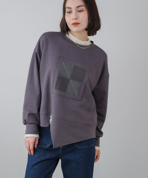 さらっと軽い着心地で、気負わず着られる大人のためのプルオーバー。フロントには別布で仕立てたスクエア型のアートデザインをあしらい、シンプルなのに自然と目を引く一枚です。カジュアルな中にも洗練された雰囲気があり、デイリーコーデにちょうどいいバランス。さらに前裾にはさりげなくカットデザインを入れることで、動きと抜け感をプラス。シンプルなスカートやパンツに合わせるだけで、「きちんとお洒落」に仕上がります。