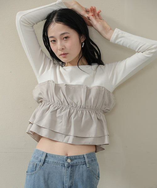 秋に大人気だったアイテムが春もリバイバル!!ビスチェを重ね着しているようなレイヤードデザインが目を惹くロンT。トップスの下部分にたっぷりと別素材の生地をあしらい、ふんわりとしたバルーンスカートのようなシルエットを描きます。一枚でコーデが完成する華やかさがありながらも、ロンTの着やすさを兼ね備えた、デイリーに取り入れやすいアイテムです。