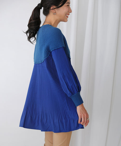 ニット仕立て、胸下はプリーツ加工のシャツ地。