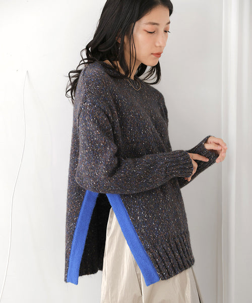 毛混のカラフルネップの糸が目を引くニットプルオーバー。 サイドが大胆にスリットになっているので 中にレイヤードするもので見え方が 変わり、着用するとスリットで動きが出るのもポイントです。