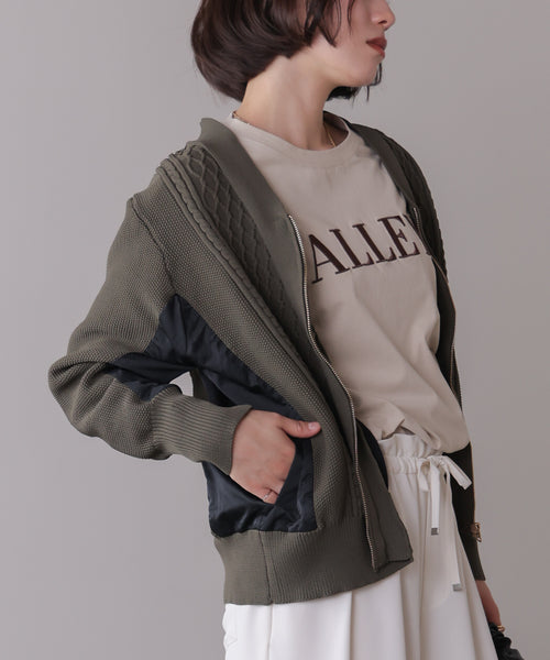 大人のカジュアルコーデにぴったりのドッキングのブルゾン。 ケーブル編みのニットの身頃に、サイドや袖の異素材切り替えが軽やかな抜け感をプラスし、動きのある表情を演出しています。 どの角度から見ても印象的に仕上がります。程よくゆとりのあるシルエットで、カジュアルにもきれいめにも合わせやすい万能アイテム。