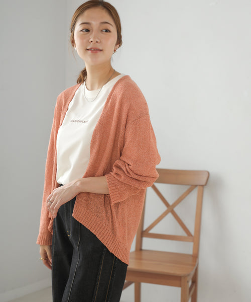 表面感のあるスラブ(節糸)と呼ばれる糸を使用したニットカーディガン。表面が不均一の為肌あたりがさらっと感じて夏場も涼しく過ごせます。見た目にも変化のある編地になります。