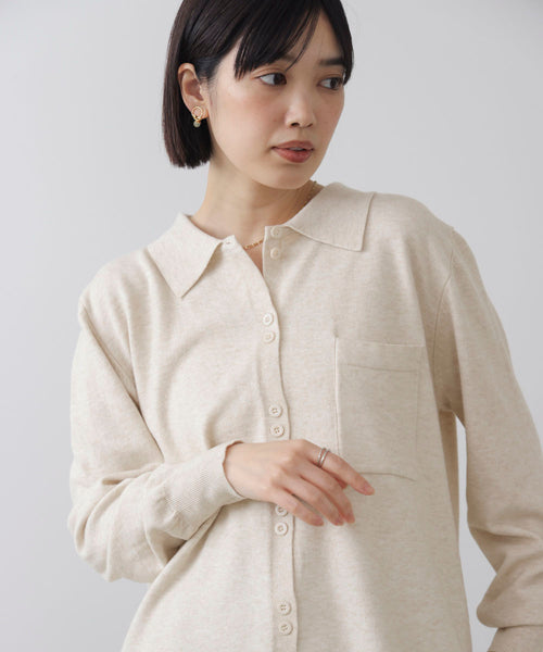 やさしい表情の素材感が魅力の、シャツライクなニットトップス。 程よくゆとりのあるシルエットと、コンパクトな襟デザインが大人のカジュアルスタイルに上品さを添えます。 ほどよい落ち感があり、身体のラインを拾いにくいのも嬉しいポイントです。
