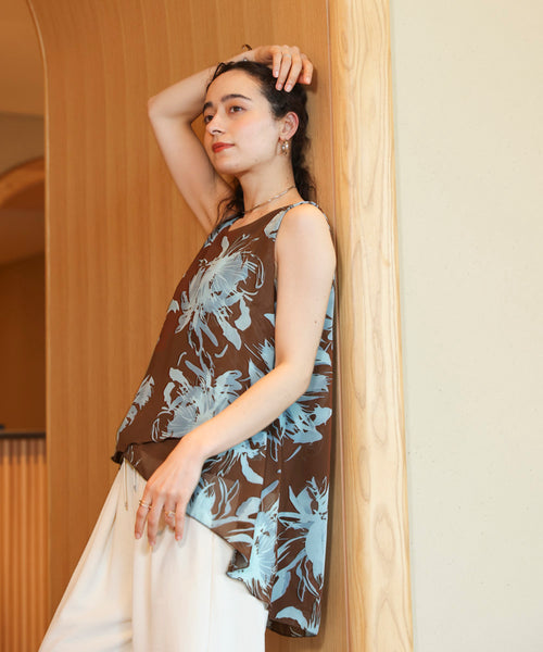 大胆なフラワープリントが目を引く、華やかな印象のシフォンレイヤードタンク。動くたびに揺れる軽やかなレイヤードデザインが、女性らしい抜け感を演出します。裾にかけて広がるフレアシルエットで体型カバーもしながら、こなれた雰囲気に仕上がるのが魅力。1枚で着映えし、シンプルなボトムと合わせるだけでスタイリングが完成するトレンド感のあるアイテムです。