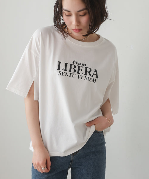 接触冷感がこれからの季節に嬉しいロゴカットソー。 袖口の前スリット開きがデザインポイントで、程よい抜け感とブラウスのような印象でキレイめに着て頂けます。 袖のハーフスリーブの長さが気になる腕回りを隠してくれるのも◎
