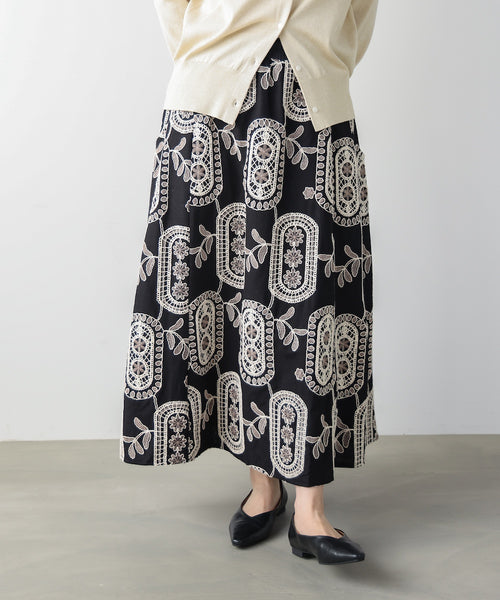 印象的な刺繍柄が目を引くロングスカートです。 程よく広がるシルエットで、存在感がありながらも上品な雰囲気に仕上がっています。 ウエストはゴム仕様で、快適な穿き心地も魅力です。