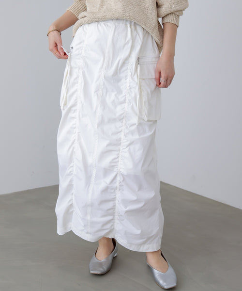 シャーリングがデザインが目を引くスカート。ワークポケットなどのミリタリーデザインがポイントに入っていながらも、シルエットやドレープ感で女性らしく仕上がるアイテムです。 ハイゲージのニットやスウェットとの合わせでデザインを際立たせるスタイリングもおすすめですが、落ち着いたカラーリングでIラインのシルエットなので、デザインアイテムとも合わせやすく1枚あると重宝するスカートです。 ウエストがリブなので楽ちんに着れるところも嬉しいポイントです。