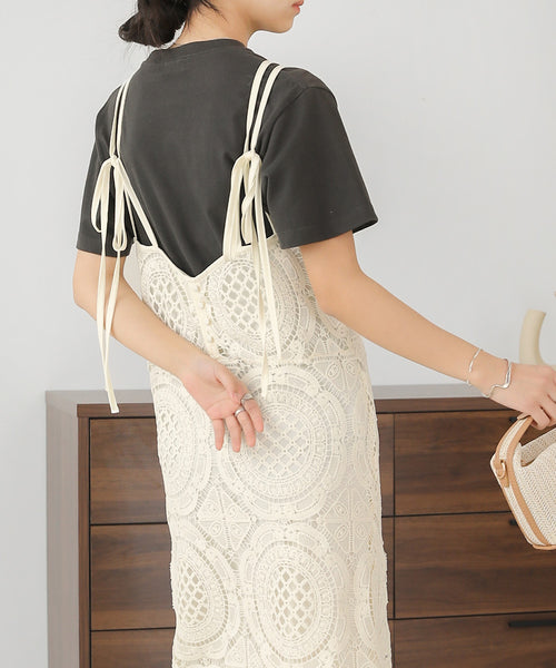 ストンしたシルエットが綺麗な総レースのデザインワンピース。総レースが贅沢に施されており、1枚でオシャレ見えする一着になっています。 肩紐の部分がリボンになっていて長さの調節も簡単! インナー次第で年中使えるアイテムで、ニットやスウェットなどを上から着ることでスカートとしても使えて着回し抜群なのもポイントの1つです。