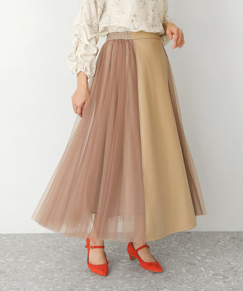 レザーとチュールのドッキングが異素材で珍しいフレアスカート