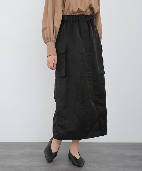 立体感のあるフラップポケットにジップのアクセントで、大人のワークスカート。 お腹やヒップ周りをカバーする程よいウエストギャザーに、長すぎない丈感が体型を選ばず着やすいデザイン。 ナイロンのハリ感とほのかな光沢感のあるナイロン生地を使用しているので、カジュアルなトップスを合わせても、 カジュアル過ぎずに着こなせます。 前開きファスナーでダブルカンで着脱。 両サイドのドットボタンはデザインでもあり、ボタンの位置を変えて、ウエストサイズ調整も可能です。 ボリュームのあるニットやトップスでメリハリを出したコーディネートがおすすめです。