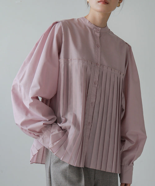 注目のプリーツを施したデザインブラウスの登場です。胸下の高い位置での切り替えが目線を上にもっていくのでスタイルアップが叶います。ぽわんとしたお袖のボリュームスリーブも存在感があり目を惹きます。1枚でこなれ感を演出できる1ブラウスです。
