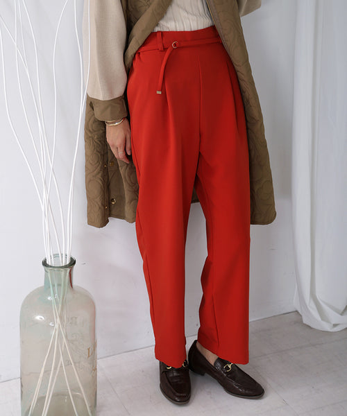 スッキリとしたストレートシルエットに細いベルトでオフィシャルにもカジュアルにもアレンジできるデザインのパンツ。 しっかりとした張りのある生地感なのに縦にも横にも伸びるので動きに沿ってくれて、シルエットをキープしてくれます。 ダークカラーになりがちなアウターからポイントでカラーでコーデしていただきたいRED。 御呼ばれシーンにも対応できるダークネイビーの2色展開。