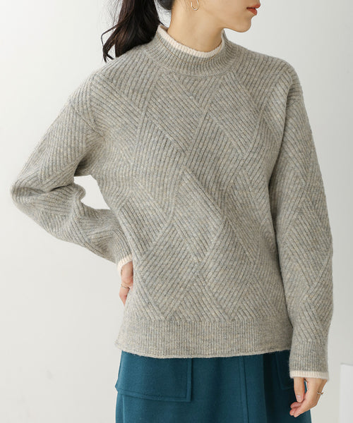 格子の様な立体的な編地がポイントのニットプルオーバー。 しっかりとした厚みがあり、1枚でもしっかり暖かい。 柄がしっかりとはいっているので、ベーシックなシルエットに仕立てて、 コーディネートしやすい雰囲気にしています。 ポイントでラインの配色を使用してさりげないポイントにしています。