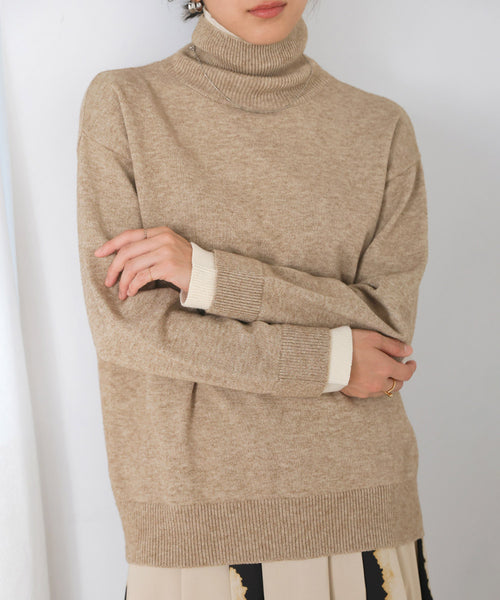 シンプルなニットタートルに、袖先の配色がさりげないニット。 ヒップラインを隠す長さで、ほどよくゆったりしたサイズ感です。 プリーツスカートやワイドデニム、細みのパンツと着回し大活躍まちがいなし!!