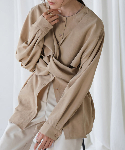 フロントの立体的なビスチェ風ねじりが目を引く主役級のブラウス。