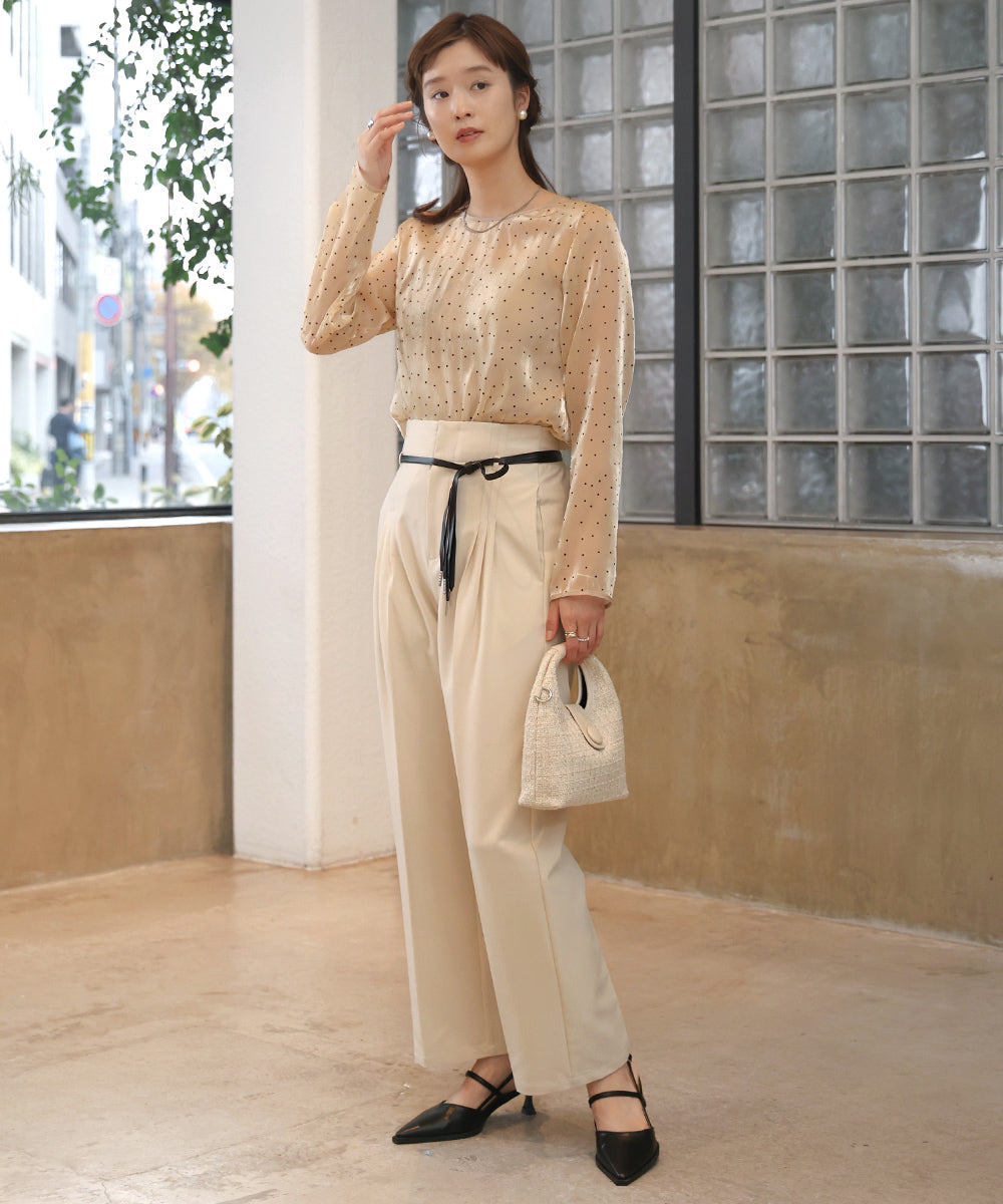 ブラウスをインしたコーデで、よりウエストの細見えが際立ちます。
