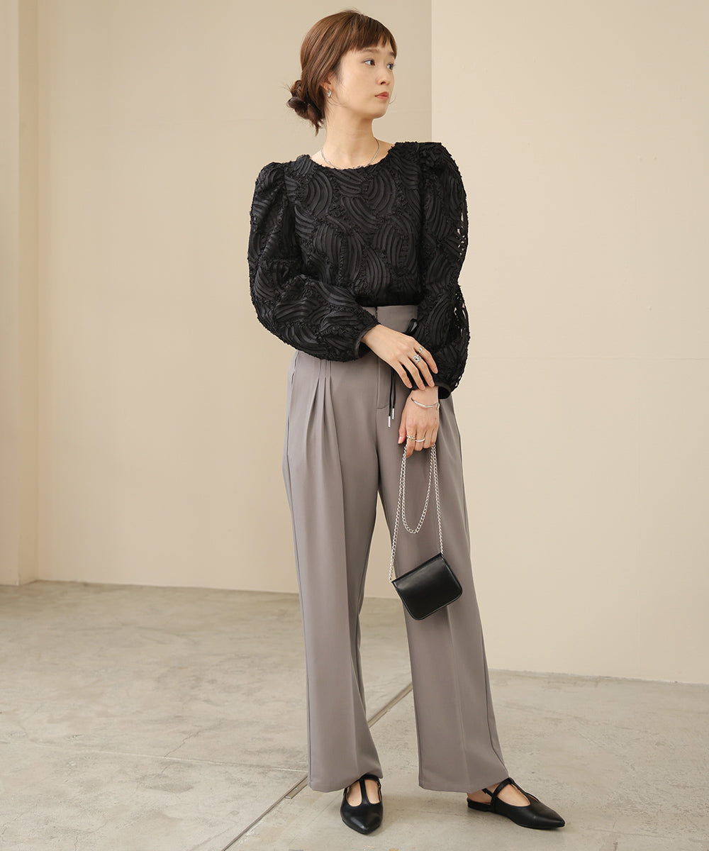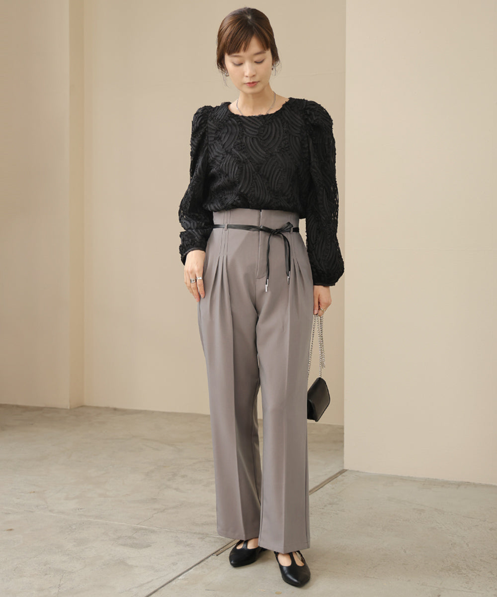 マニッシュでハンサムな印象のスラックスを、華奢なフェイクレザーベルトをセットにして女性らしさをプラスしました。