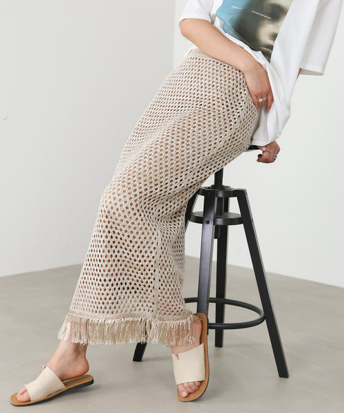 小さなスパンコールが所々に編み込まれた、シーズンムード高まるメッシュ素材のスカートです。
