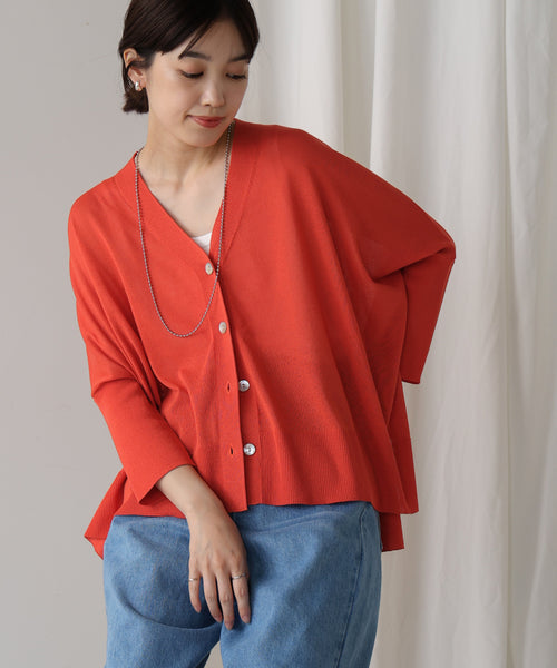 BOX型の貝釦付きニットカーディガン。たっぷりの分量と裾の スリットが風通しよくサラリと着こなせます。程よい開きのVネックで 抜け感もプラス。前後差ありで後ろ丈が長いデザインなのでお尻が隠れる 丈感も安心なアイテムです。