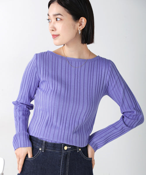 2種類の糸を表面と裏面に編み分けるプレーティングという技法を用いたリブニット プルオーバーです。襟元のボートネックが大人の女性のデコルテをスッキリと見せて くれます。 リブ編みにしている為、テンションもあり良く伸びるので着心地も良いです。 何にでも合わせやすいライトベージュとネイビーに加え、シックで明るさのあるブルー をオススメカラーとしてチョイスしています。