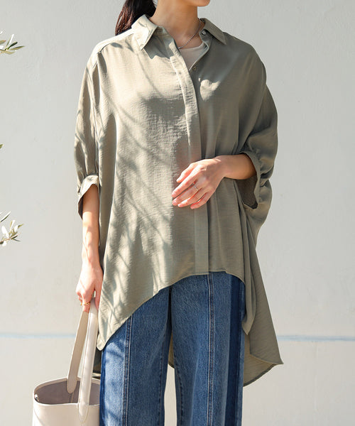 裾にかけて広がりのあるゆったりデザインドルマンシルエットは、シャツとしても袖のゆとりをいかした羽織としても使いやすいアイテム。ゆったりデザインときちんと感のある開襟シャツのバランスでラフなのにキレイメスタイルになります。