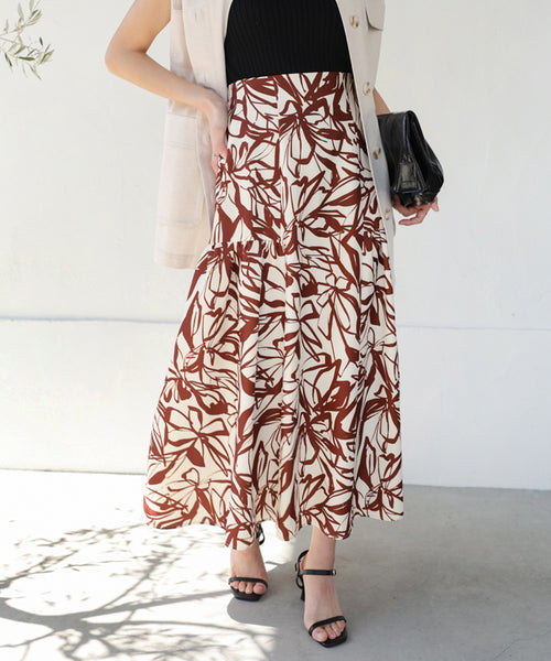 表面が凸凹し生地に、手書き調の大きめのフラワー柄をプリント。腰回りはポケットデザインすっきり見せつつ、サイドティアードで程よいボリューム感を出しています。