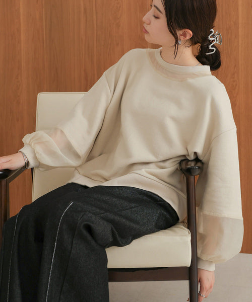 ライトな裏毛素材でイージーな着心地ながら、シアー部分からの控えめな肌見せで大人っぽい印象に仕上げてくれます。 ライトな裏毛素材でイージーな着心地ながら、シアー部分からの控えめな肌見せで大人っぽい印象に仕上げてくれます。 緩く前後差をつけた着丈で抜け感も◎! 緩く前後差をつけた着丈で抜け感も◎! 袖口のふわっとしたシルエットも目を引くポイントです。 袖口のふわっとしたシルエットも目を引くポイントです。 Babらしい淡色の3カラー展開です。" Babらしい淡色の3カラー展開です。"  ナロースカートからスラックスまで、合わせるボトムスを選ばない優秀な1枚! ナロースカートからスラックスまで、合わせるボトムスを選ばない優秀な1枚! シアー部分がアクセントになり、カジュアル過ぎずにお召し頂けます。 シアー部分がアクセントになり、カジュアル過ぎずにお召し頂けます。