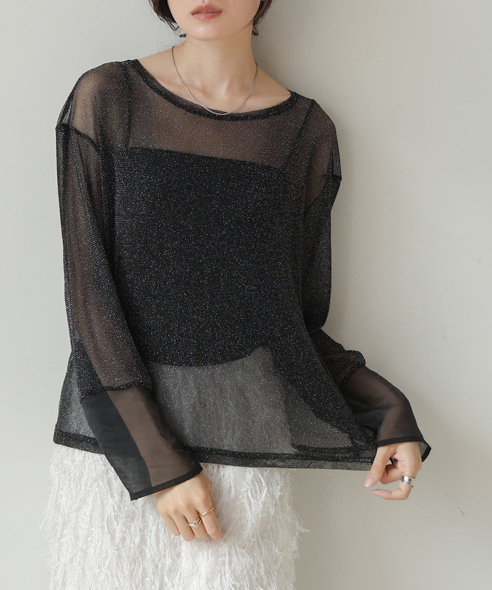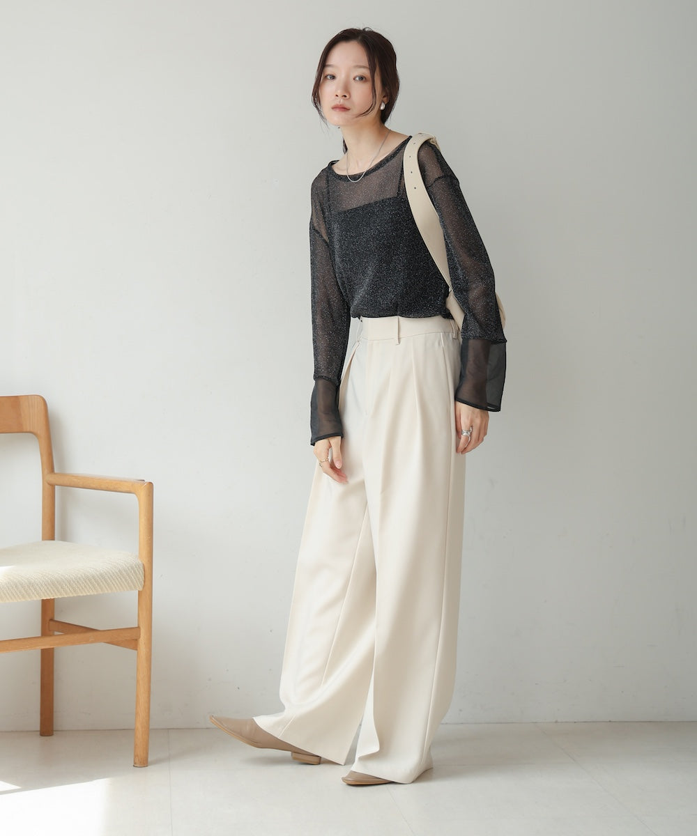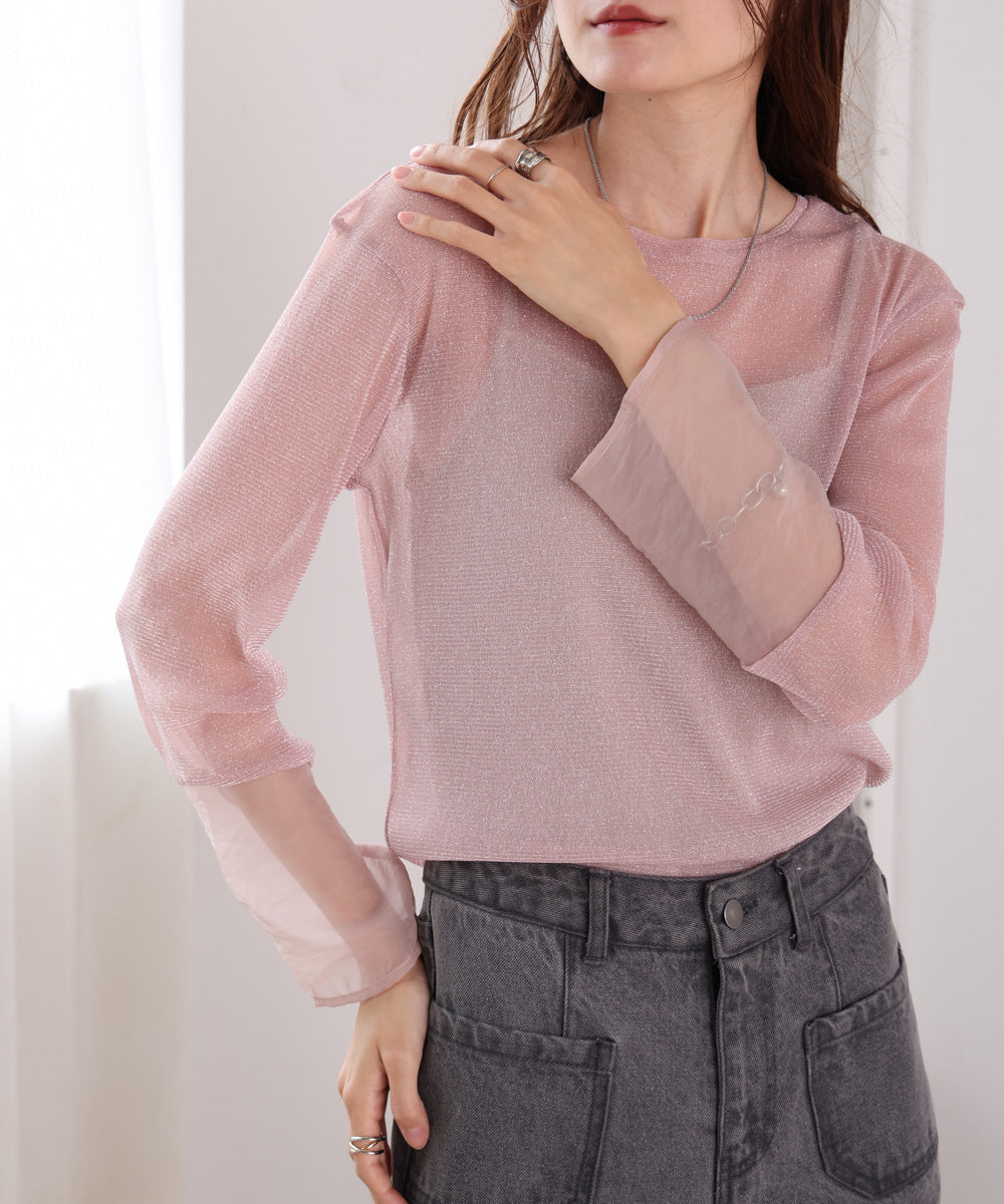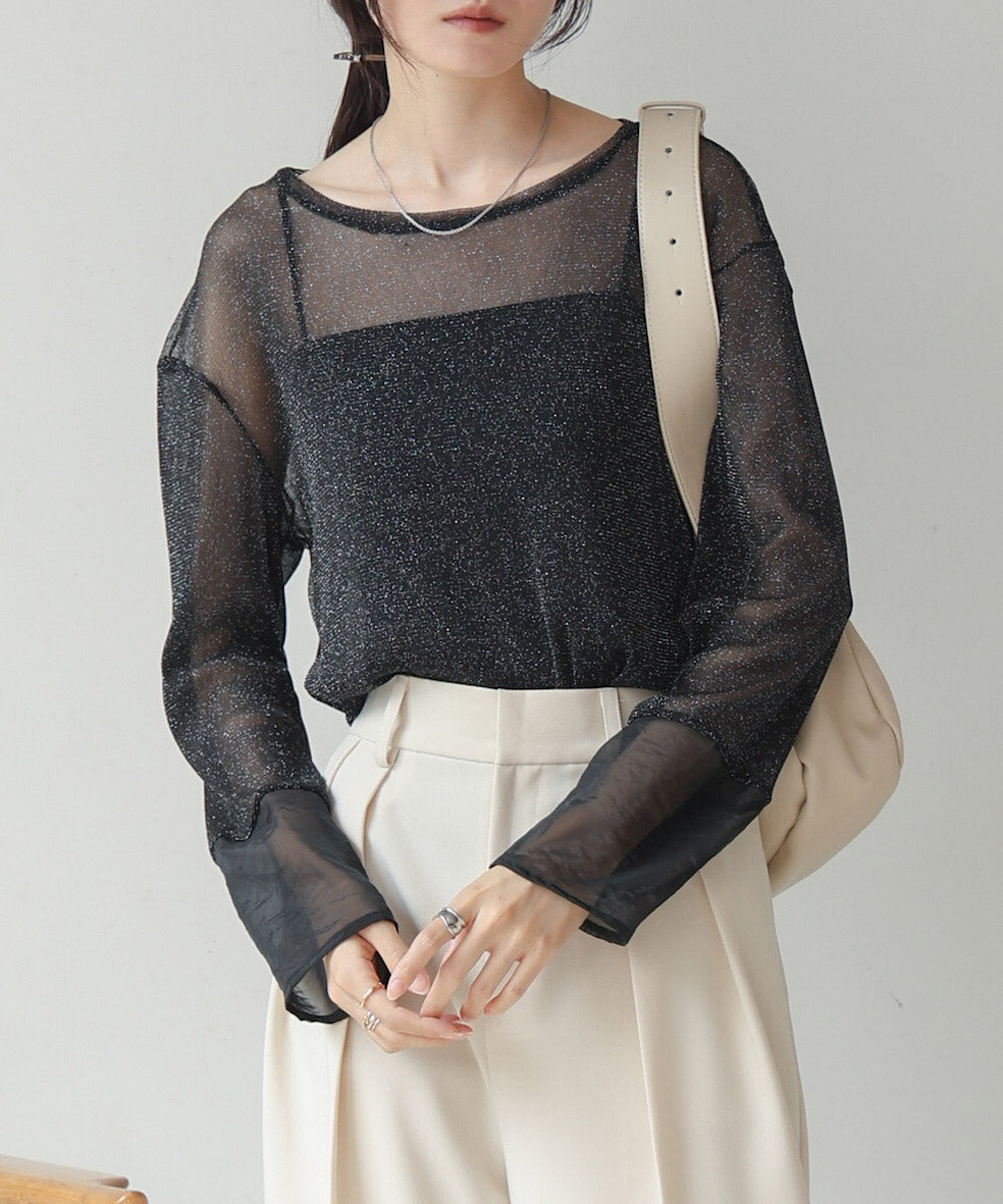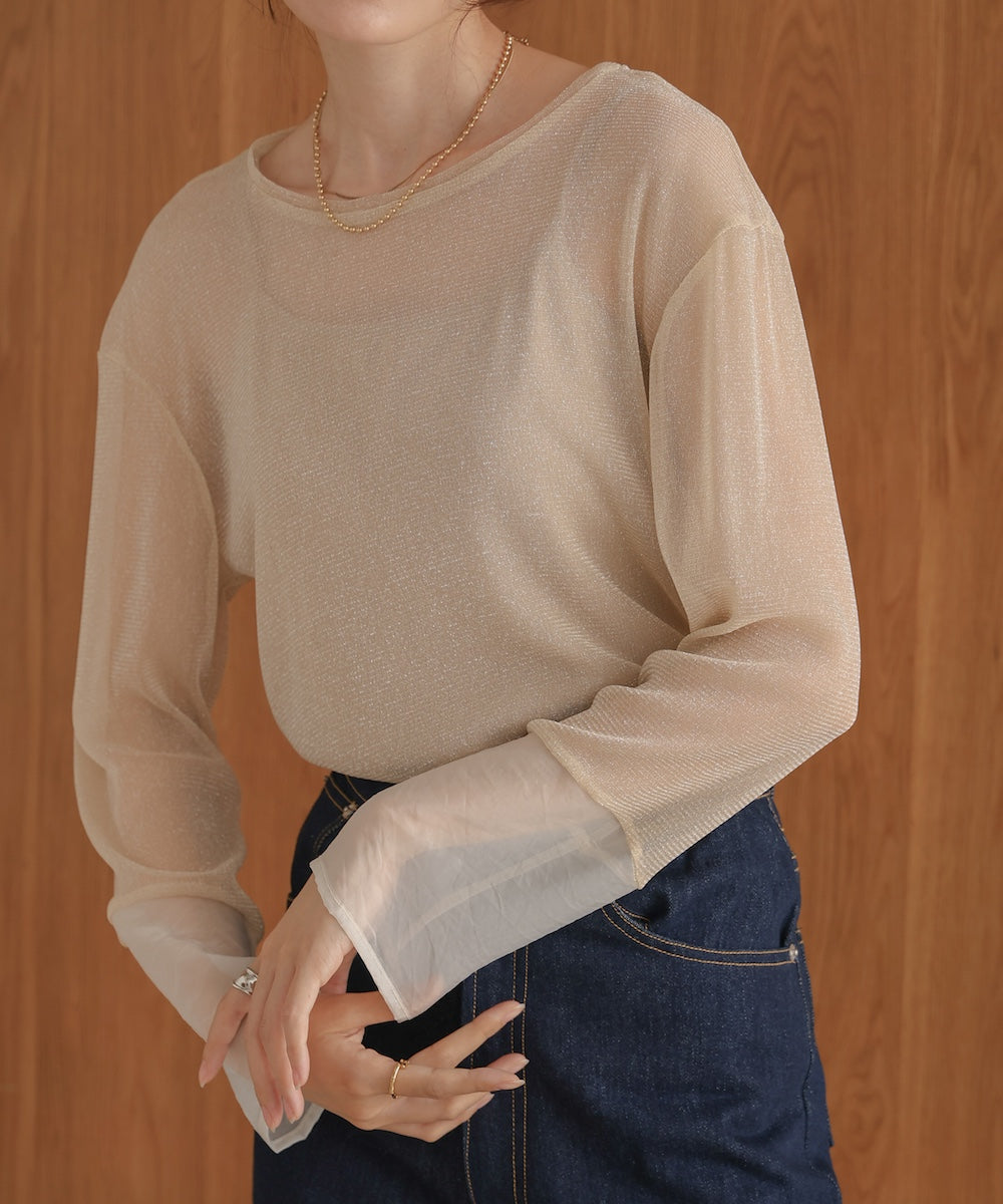 袖のオーガンジー生地が上品な秋のコーディネートに透明感をプラスします。