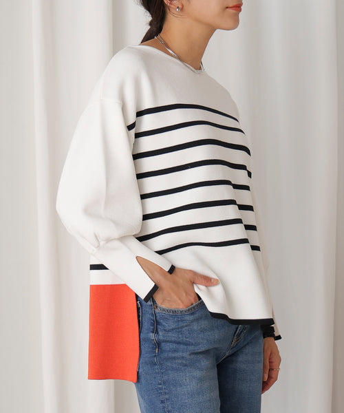 大人のカジュアルコーデをを引き立ててくれるアイテムです。 振り返るとバックスタイルに大胆に切り替えられたバイカラーブロッキングがアクセントになり、コーデを華やかに魅せてくれるニットです。 袖口はスリットが入っており抜け感を演出。