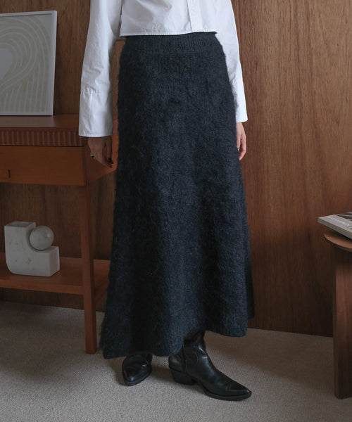 \手洗い可能/旬なフェザーニットが上品さ加速させるスカート。[KEGAKI VNECK KNIT VEST (ケガキベスト)【5444007】][KEGAKI KNIT CARDIGAN (ケガキカーデ)【5444017】]とのセットアップがおすすめのアイテムです。ウエストはゴムで履き心地もよくスタイリングのメインになる主役級アイテムです。