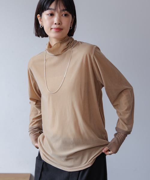 トレンドのベロアアイテムに使いやすいインナーが登場! 光沢の強くないほんのりシアーなベロアを使用。大人の方に向けたトレンドインナーです。 表側がベロアで内側はメッシュ素材で肌あたりも気にならないのも嬉しい♪ 袖口は柔らかチュールにクシュっとギャザーを加えて、ニットレイヤードも袖口までオシャレに決まります♪