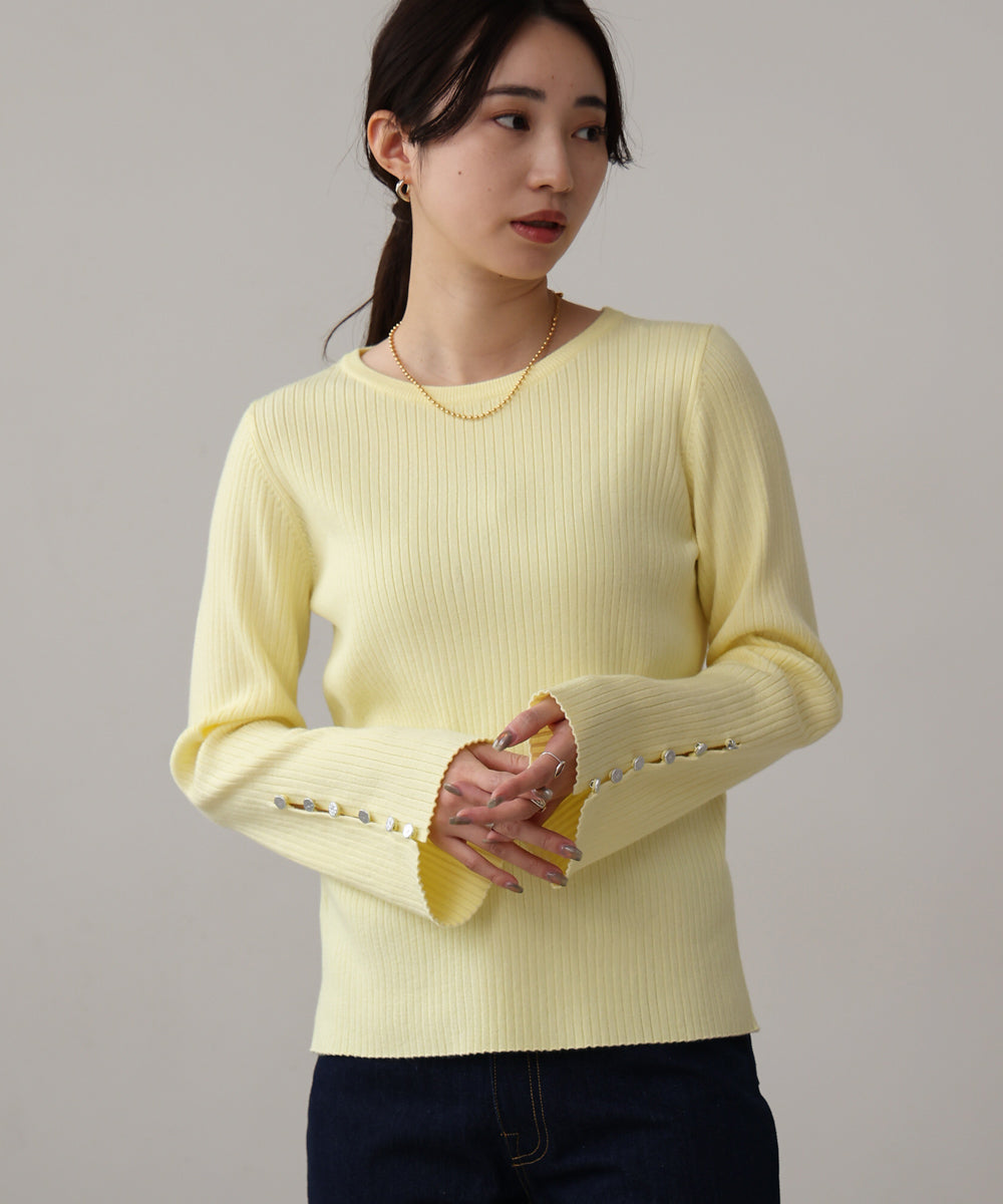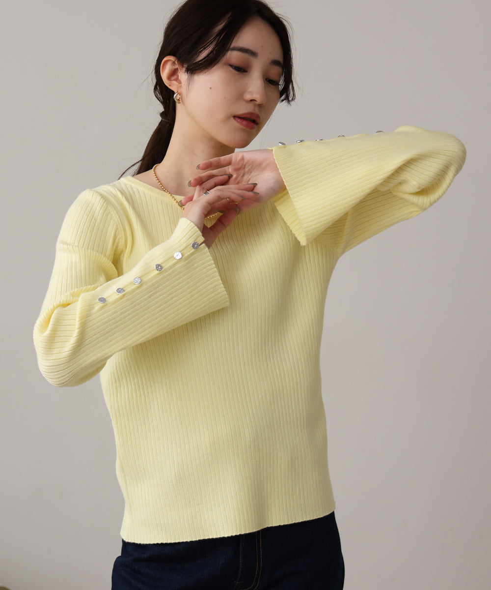 フレアスリーブにメタルボタンを大胆に1列オンして、Babらしい目を惹くリブニットが出来上がりました!