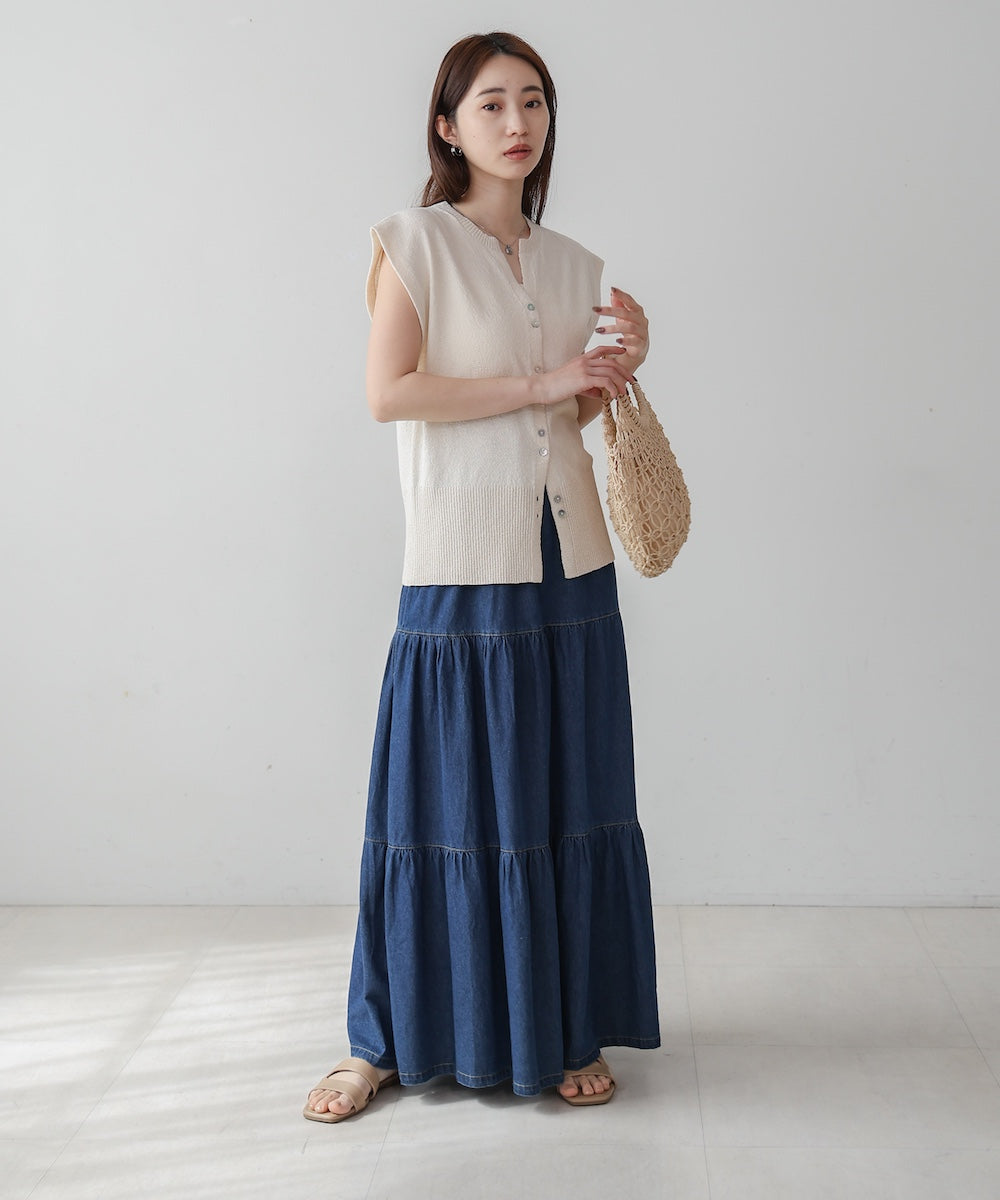 フレンチスリーブとキーネックで大人の抜け感を演出するライトなニットベスト!ミックスヤーンの上品なルックスが視線を集めます。裾はリブ編みに編み替え、幅を広く取ることで下半身の華奢見せに。2個ずつ連なったシェルボタンがさり気なくアクセントになり 繊細な輝きを放ちます。締め付け感の無い着心地ながら美しいシルエットにこだわった1枚です。