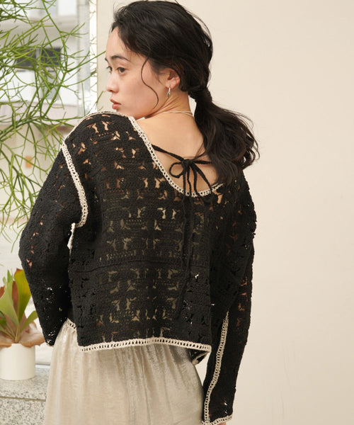 大注目のクロシェ編みシリーズに今年はコンパクトタイプなプルオーバータイプが新登場!しかも前後2WAYで着用できるので着回しも効きスタイリングのバリエーションが広がりそうなアイテムです。ヴィンテージライクな編地は程よく肌見せしてくれるので春から秋までのロングシーズンで楽しめる1着。リボンを結んだり、垂らしたりしてこなれ感のあるスタイルを実現してくれます。A色とB色は配色になっているのでコントラストが効いた1着に仕上がっています。