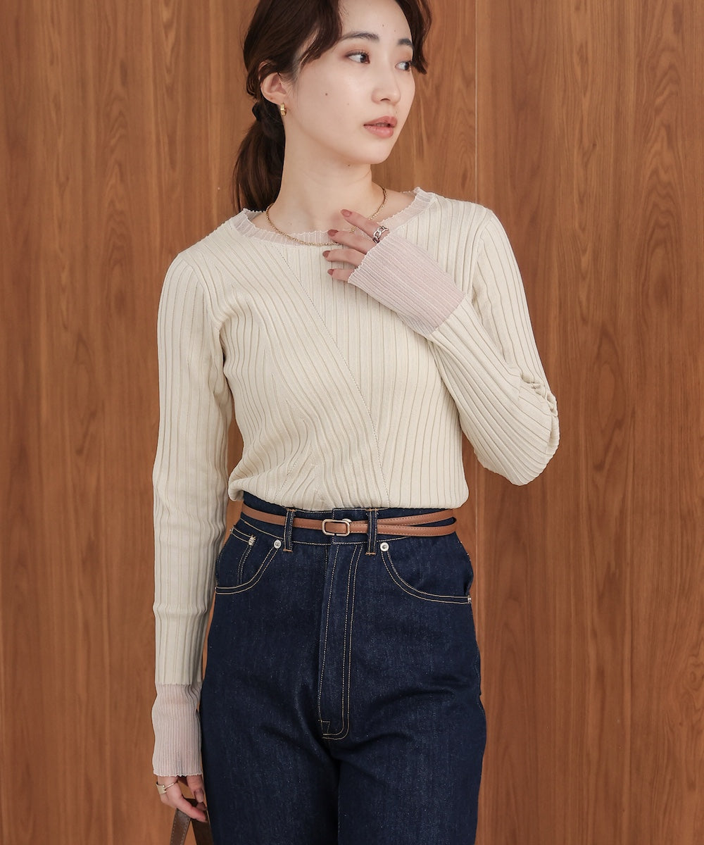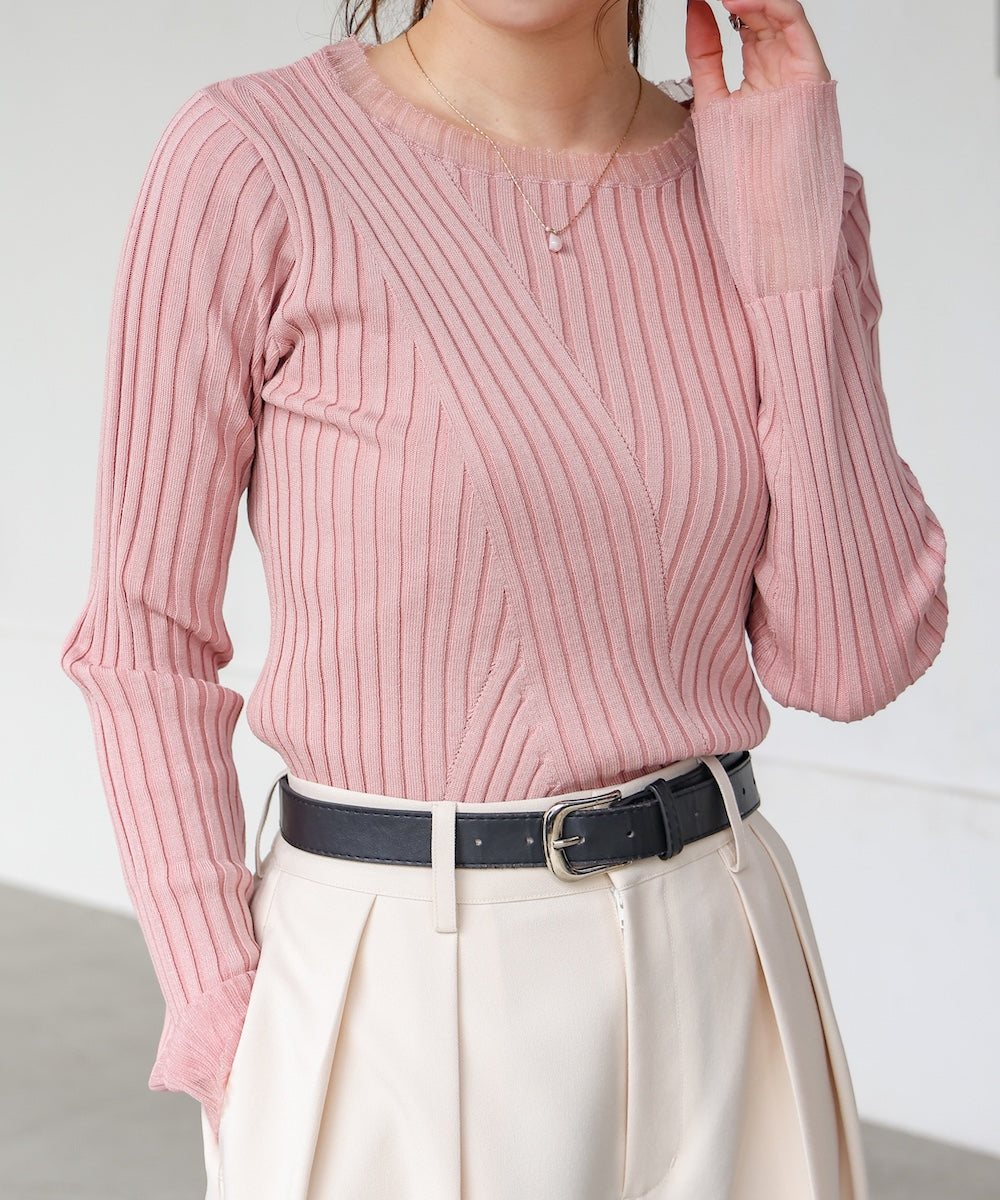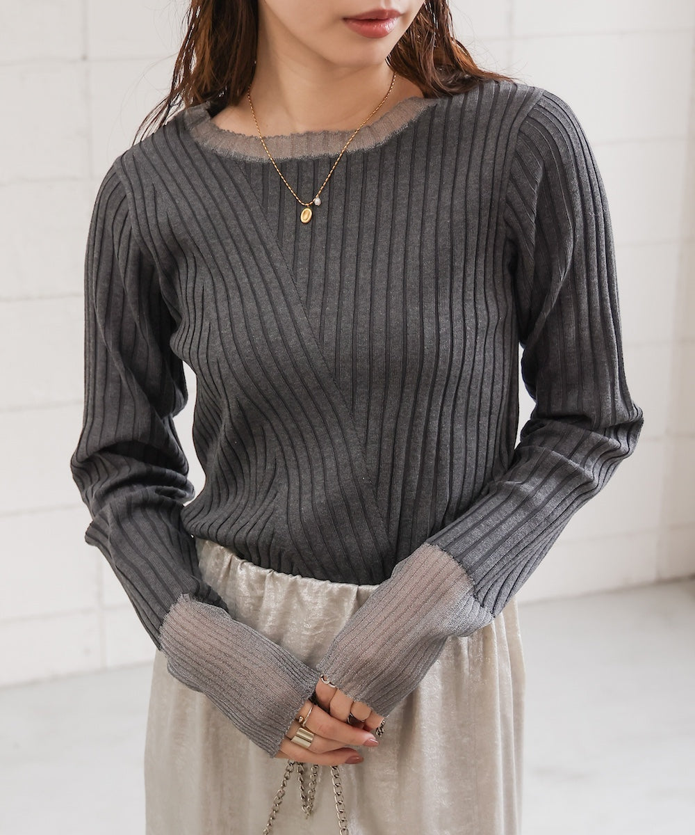 部分的に施された透け感が魅力的なシアー使いリブニットトップスが2025年SSバージョンにて登場!