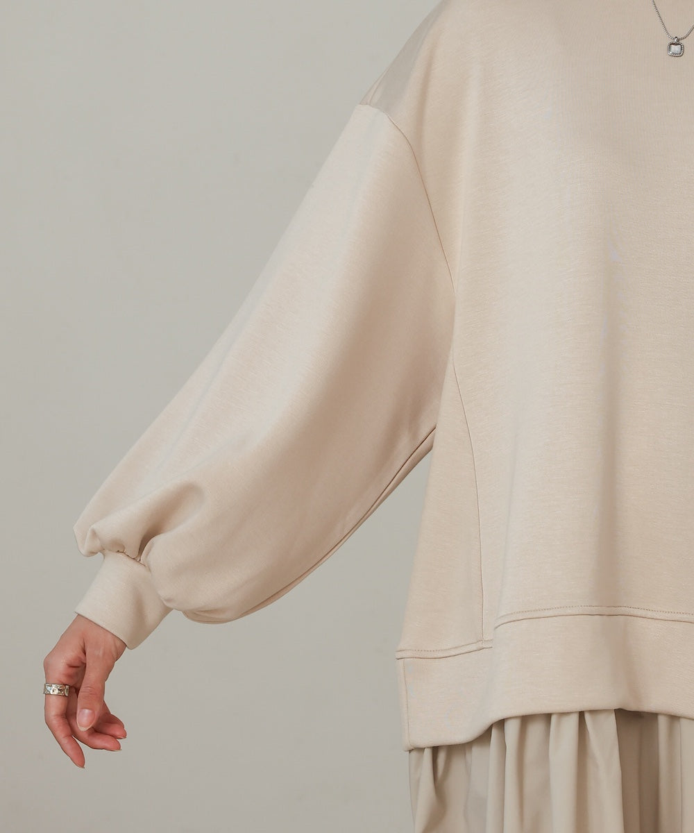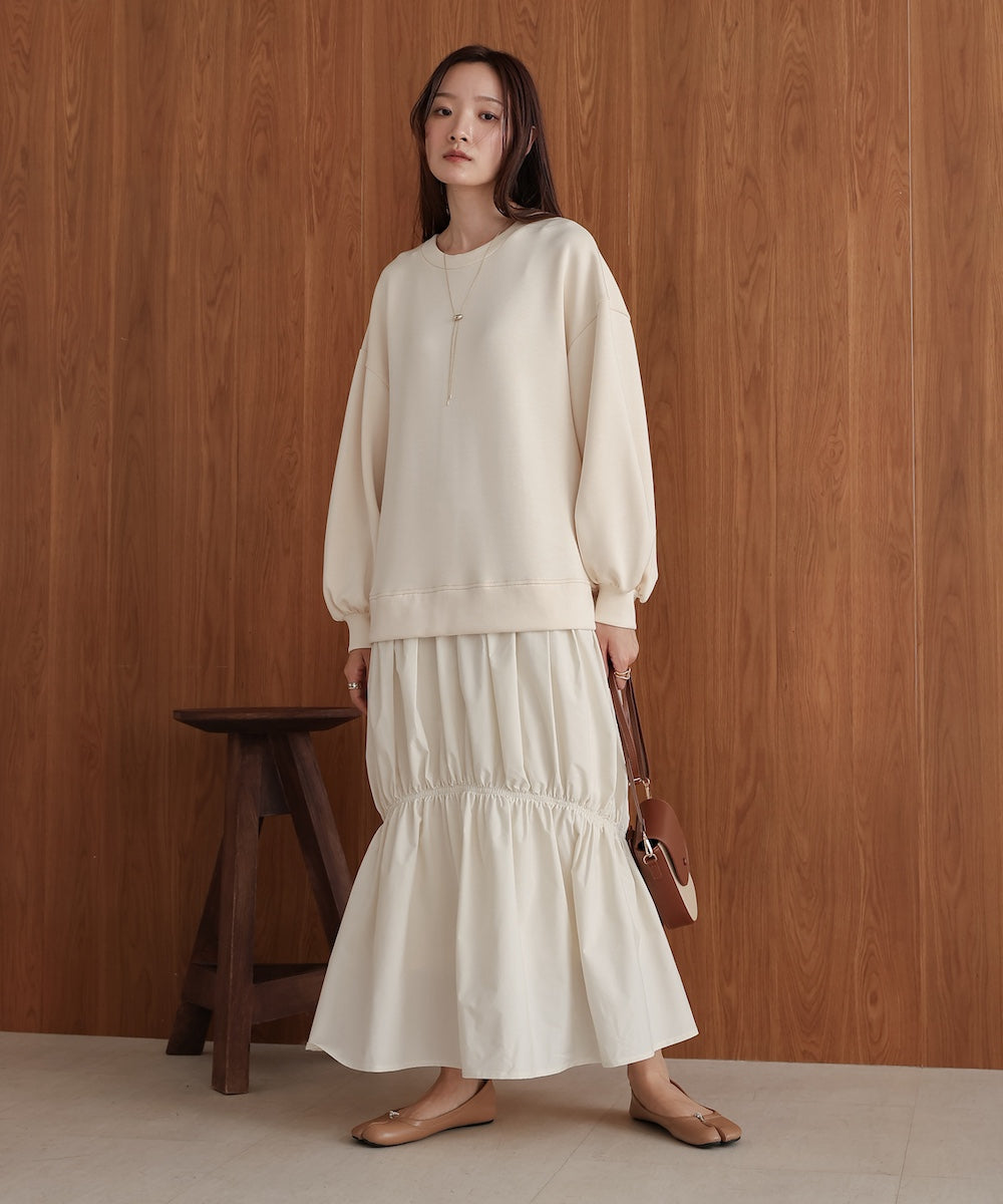 トップス部分には柔らかく着心地の良いカットソー生地を採用。スカート部分は軽やかで形をキープしやすい布帛素材。どちらも動きやすさと快適さを考えた素材で、デイリー使いにもぴったりです。