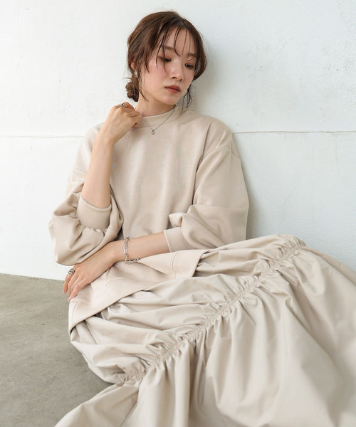 【Sサイズあり】異素材ドッキングギャザーワンピース