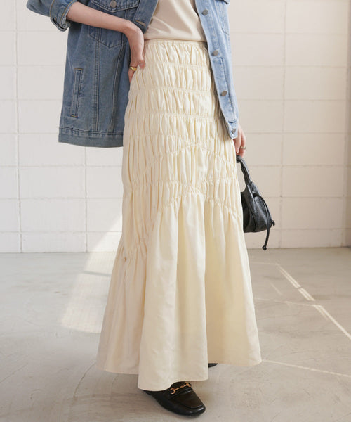 ウエストから膝下まで入ったシャーリングギャザーが魅力のスカート。
