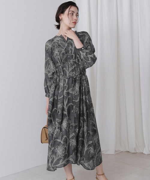 表情のあるシアーツイルプリント生地で、ドルマンフレアワンピースをつくりました。 ワイドラグランで、上身頃はゆるっと、下身頃は程よくフレアな広がりです。 ウエストのリボンは前で結んでゆるっと着こなしても、クロスして後ろで結んで、上の緩さを出した着こなし でも、リボンを垂らして着こなしたりと自由に着こなしアレンジ可能です。 デニムパンツと合わせて、カジュアルな着こなしも◎ 着脱は、スキッパータイプで、上からかぶるサックタイプです。 袖口の2個ボタンで、袖口サイズ調整可能。