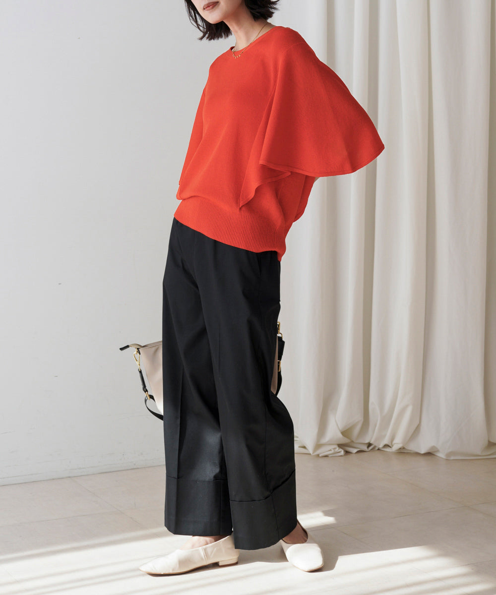 動くたびにふわっと揺れるフレア袖が、気になる二の腕をさりげなくカバー。袖の広がりは、 編地そのもので立体的に表現しているので、やりすぎない華やかさが魅力です。シンプルだけど、どこか上品。