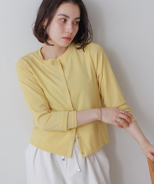 これからの季節に嬉しいUVカット機能付きのカーディガン。 シワになりずらい素材でバックの中にしのばせておくと、日除けやクーラー対策など困ったときにさっと使える優秀アイテムです! リングドット釦の金属がキラリと映えて、ポイントになりつつもコーデの邪魔をせずに合わせやすいデザイン。 前を閉めてTOPS感覚でも使って頂けます。