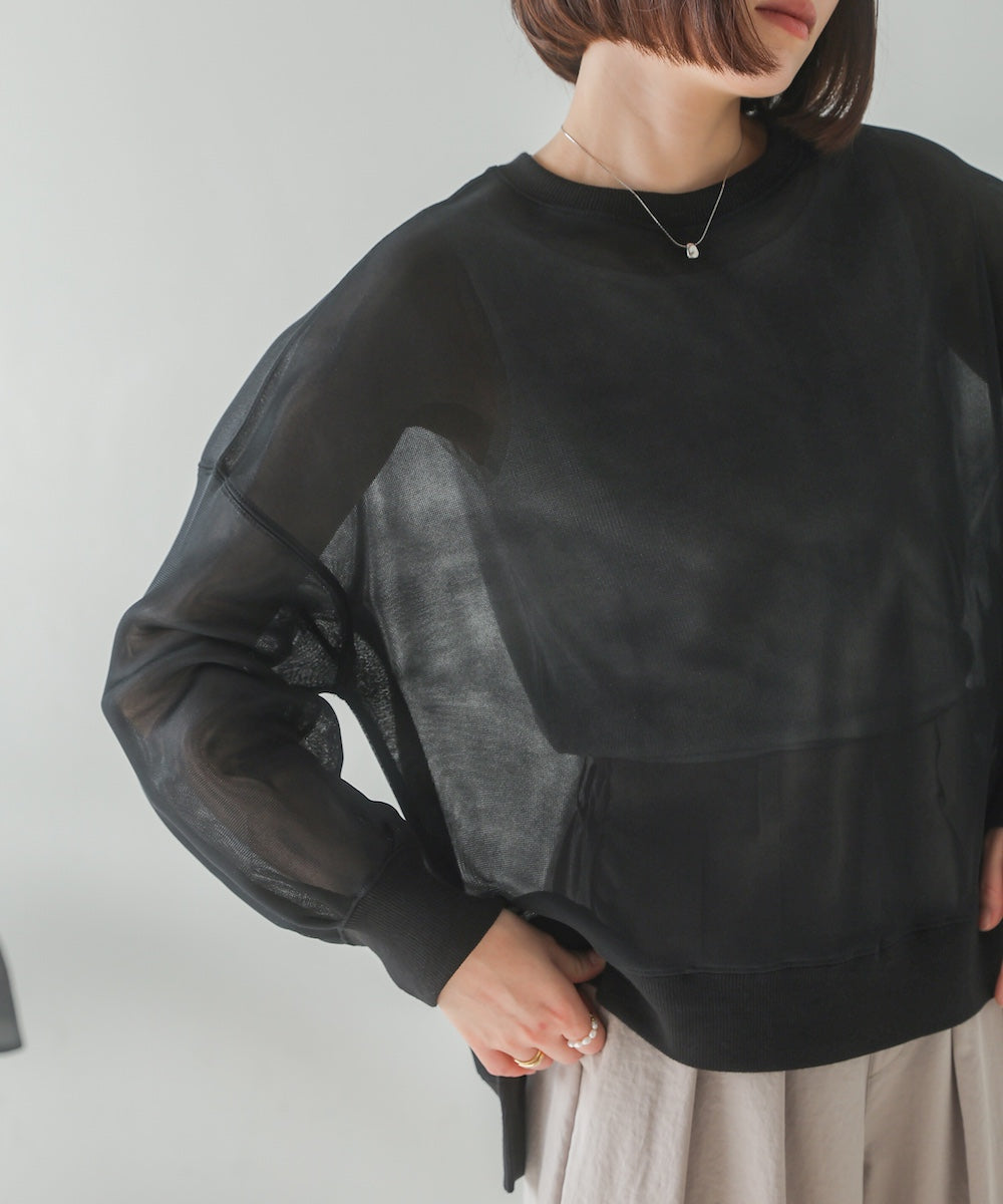 トレンド素材のシアー感のあるダンボール素材を使ったプルオーバー。ほんのりとした透け感なので、気軽に着ることができるアイテムです。 あえてのカラーのインナーを透けさせたり、長袖やタンクトップなどインナーで表情を変えられるので、アレンジを楽しんで頂けます♪ 袖を立体的に見せるように切替とタックを入れているので、すっきりとしていながらも袖ボリューム感で着痩せして見せてくれます。