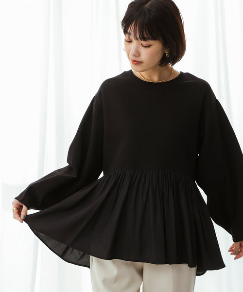 カットソー×たっぷりギャザー切替のデザイントップス。 袖ボリュームで全体的に女性らしいシルエットにこだわりました。 程良い厚みの素材で、肌寒い時期にも春らしさを取り入れやすい1枚です。 パンツやタイトスカート合わせがスタイルアップコーデでお勧めです。
