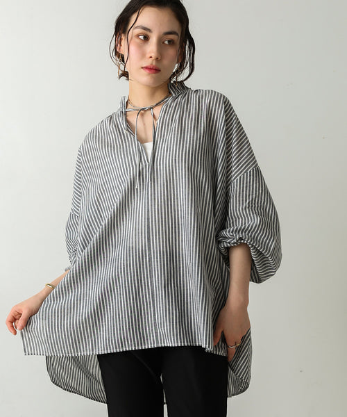 衿元には細かなスタンドのフリルで上品なフェミニンさを感じさせつつ、たっぷり入った身頃と袖のギャザーディティールの映えるブラウス。 細かなピッチのストライプが無地とは違った表面感を演出。