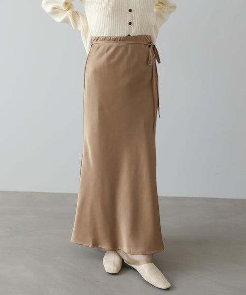 歩くたびに揺れる裾のシアー切り替えが女性らしさと抜け感をプラスしてくれます。光沢感のあるサテン素材が上品な印象を演出し、シンプルながらも目を引く1枚に仕上がっています。さらにリボンをつけることで通常のサテンスカートよりもぐっとフェミニンさが増し、デイリーにもオフィスにも着ていただけるスカートに仕上がりました。すっきりとしたナローシルエットでスタイルアップ効果も◎1枚持っておくと万能なアイテムです。