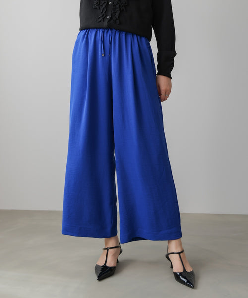 ナチュラルな表情で落ち感とストレッチ感のあるリネンライク素材を使用した リラクシーなムードのあるワイドパンツ。ワイドなウエストギャザーがデザインポイントです。 ウエストオールゴム仕様です。 しわになりにくく、ストレッチ感のある素材で、カットソーだとカジュアルすぎてという方に◎ ちょっと、きちんと感の出せる軽めのパンツとして、旅行にも最適。 これからの季節に重宝する一枚です。