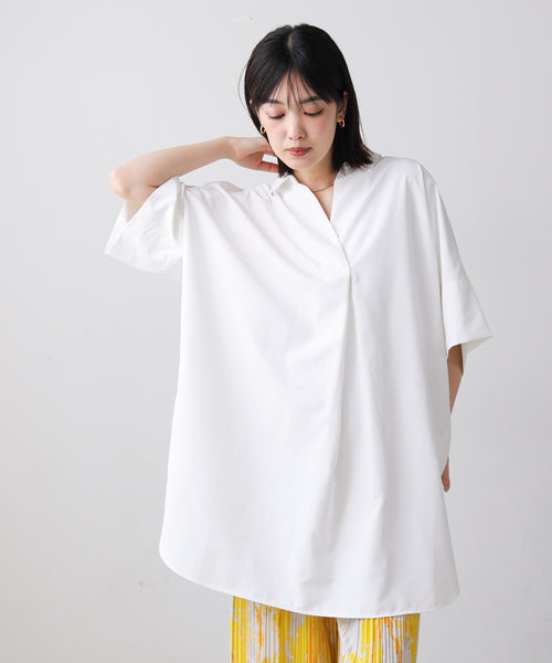 一枚着れば完成するスキッパーシャツチュニック。スキッパーデザインで首回りすっきりみえて、 衿付きで首元の暑さや日焼けをカバー。 ゆとりのあるワイドスリーブが腕まわりを華奢に見せてくれます。 ゆったりしたオーバーサイズ。リラクシーでこなれた印象に。 広がりすぎずにすきっと着れるシルエット。ワイドなバックタックで動きがでる後ろ姿。 着脱は前開きなし。かぶりタイプです。