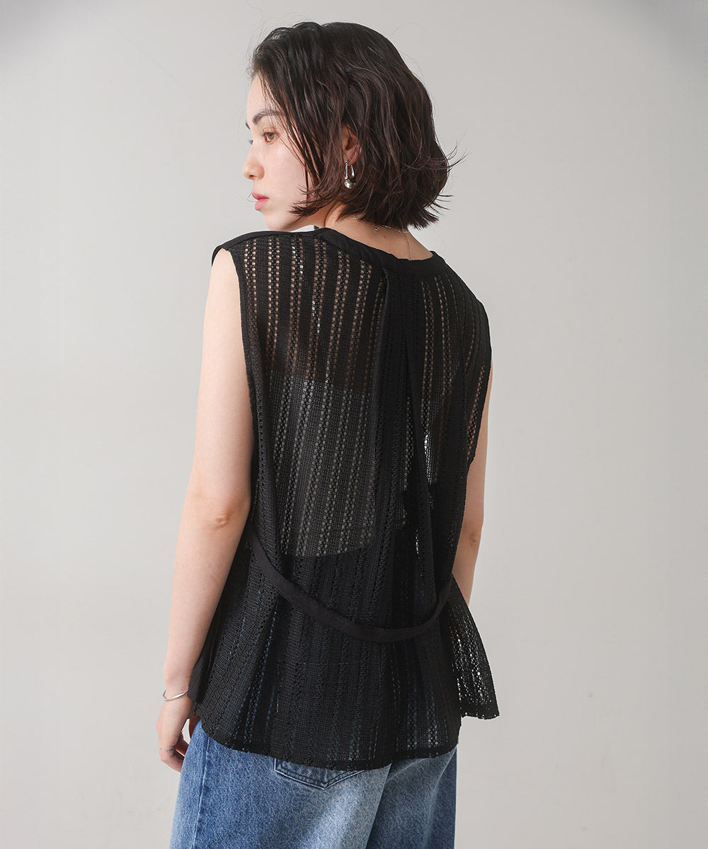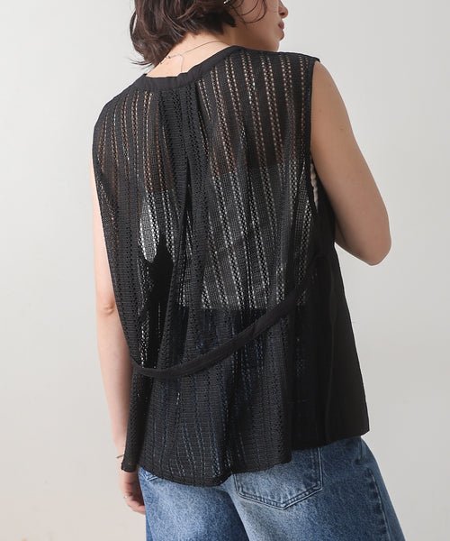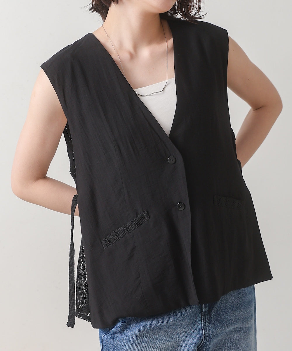 いつものコーデにプラスするだけでオシャレ感がUPするバックレースのジレ。 細部までこだわり抜かれたデザインのジレが洗練された印象を与えます。 後ろ身頃は透け感のあるレース素材で軽やかに仕上げ、後ろ姿まで抜け目ないデザインになっています。