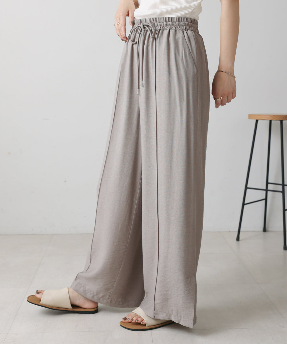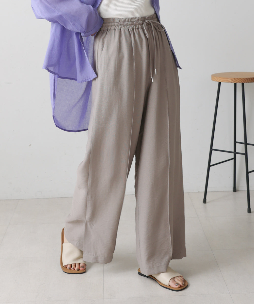 リラクシーながらも、センターピンタックデザインで程よいセミワイドパンツ。 カジュアルになりがちな夏に向けて、日常に使いやすくてきちんと見えします。 裏地もなく、軽めに仕立てて、これからの時期に着まわしやすくしました。 ウエストオールゴムの紐付きデザインでウエストサイズ調整可能。